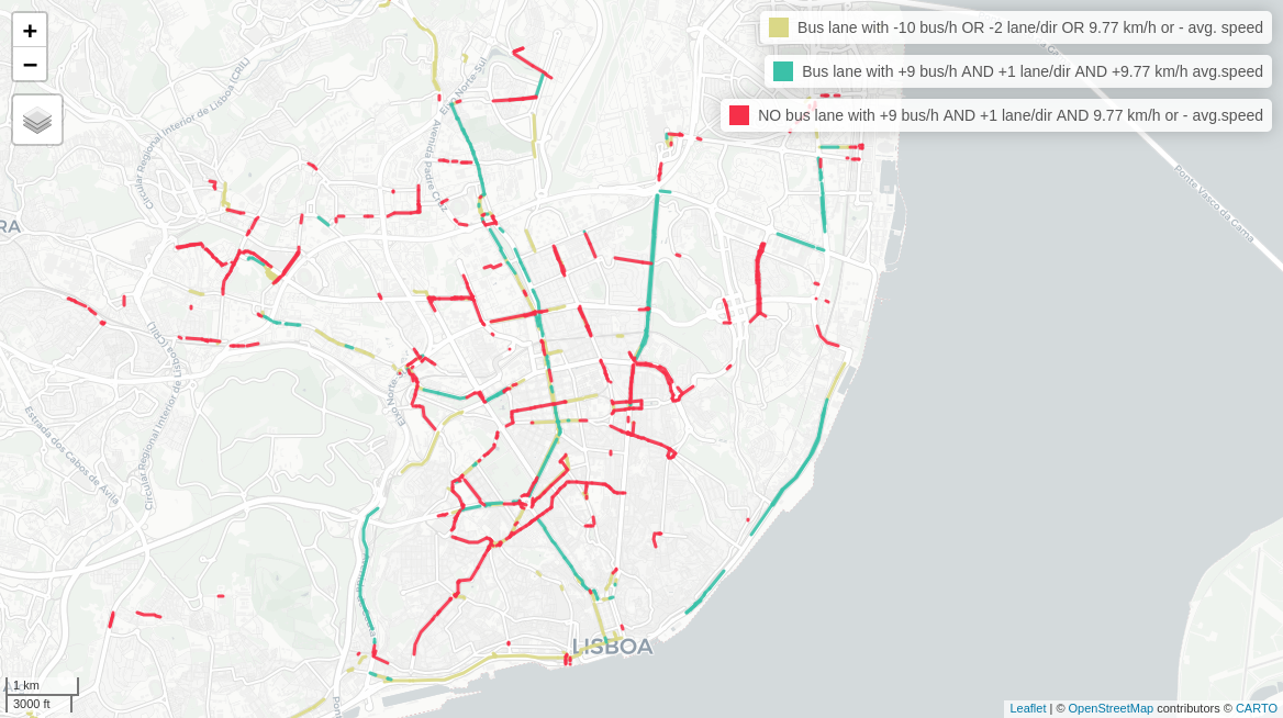 Example of bus lane prioritization analysis for Lisbon city, considering road segments with a minimum frequency of 10 buses/hour, average commercial speed below 9.7 km/h and more than 1 lane per direction.