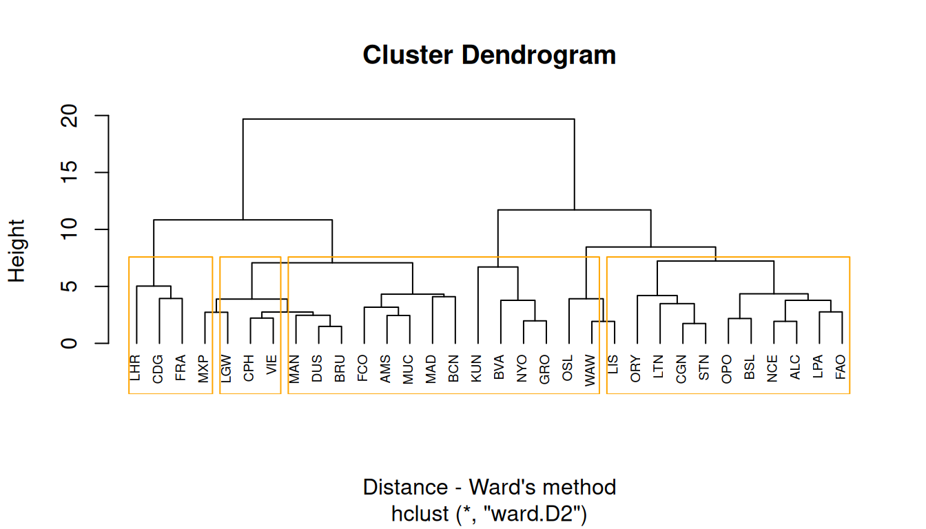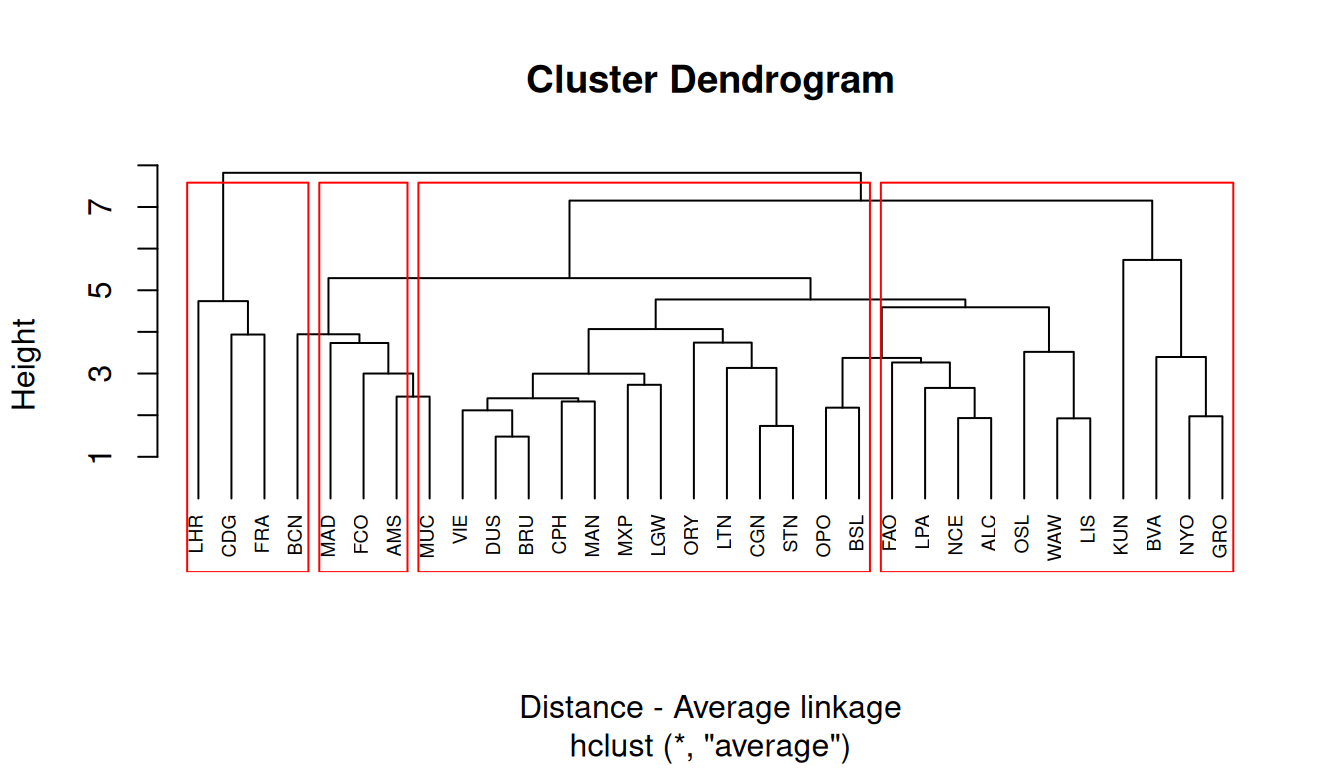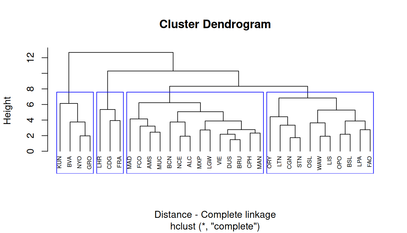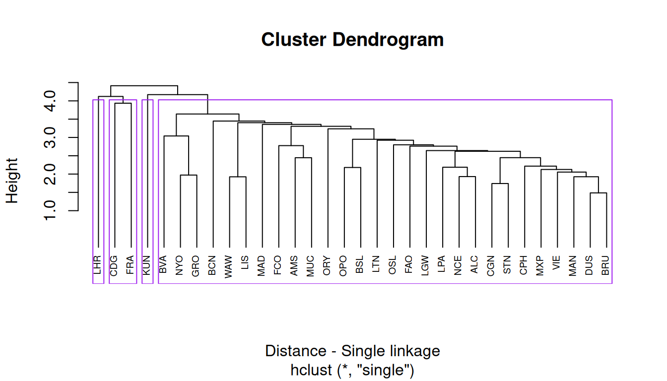 Remove one airport from the data, at your choice, and re-run the cluster analysis.