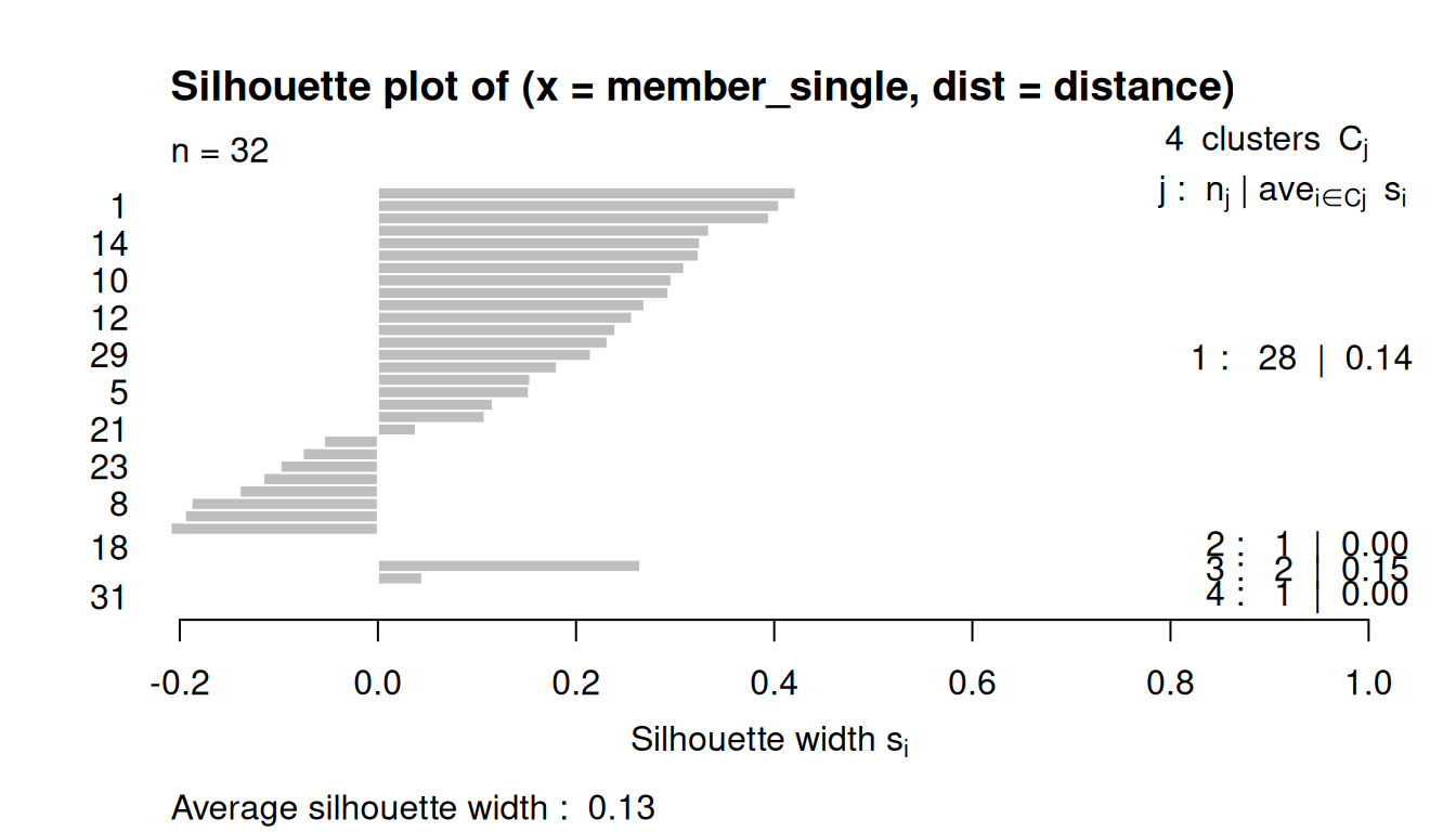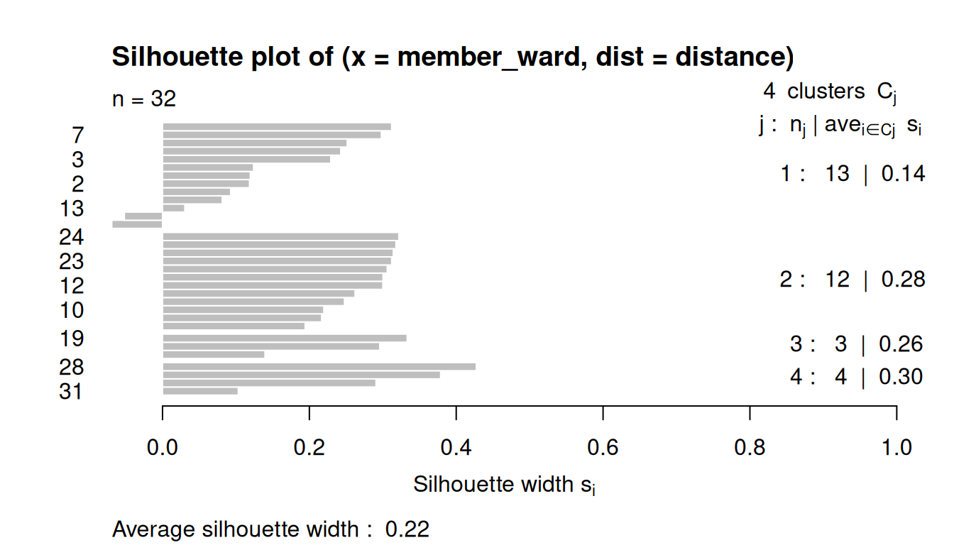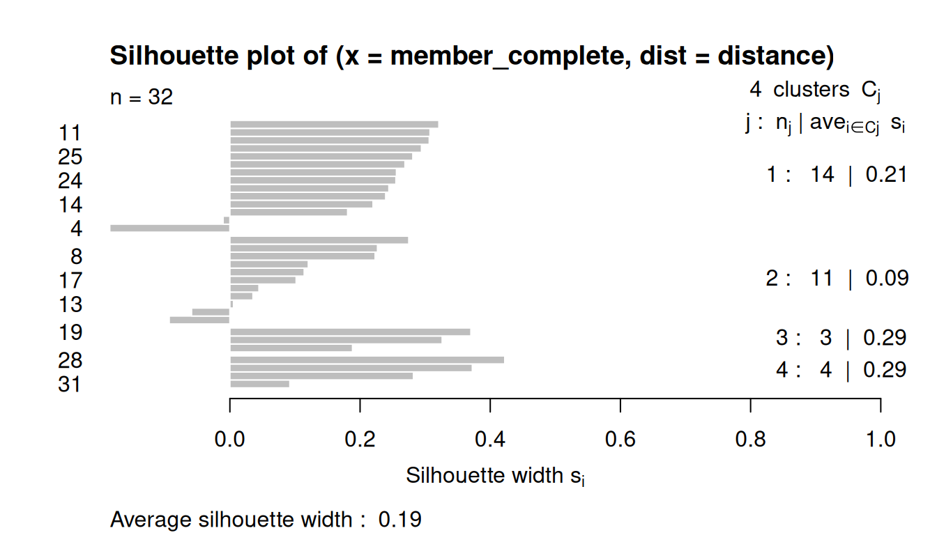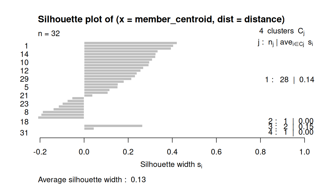 Low or negative values indicate that the clustering method is not appropriate or the number of clusters is not ideal.