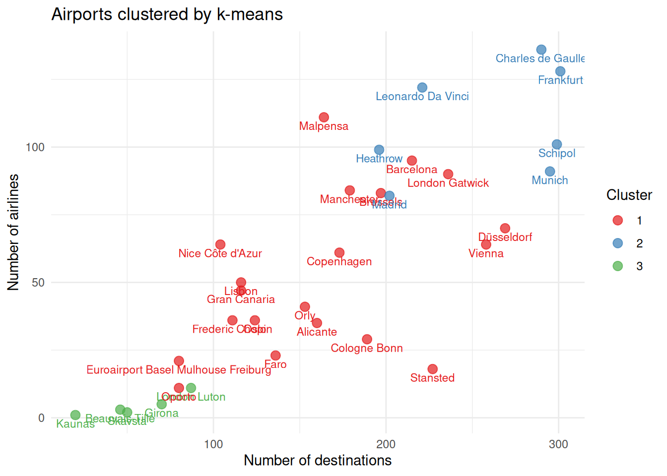 title = "Airports clustered by k-means",