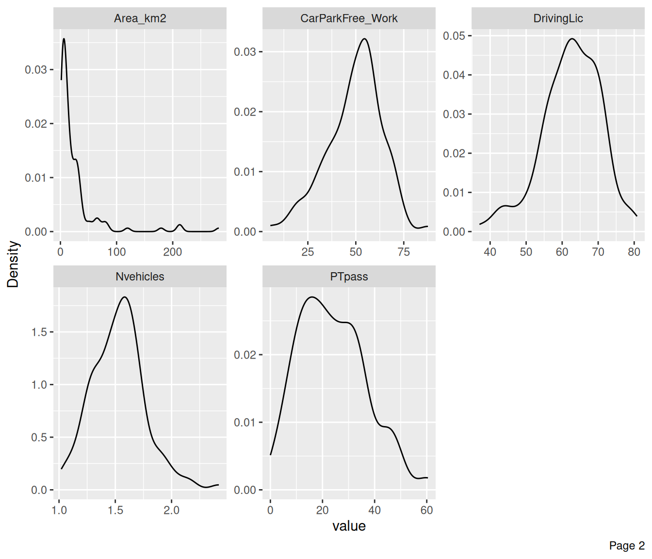 plot_histogram(data, ncol = 3) # histograms with 3 columnsplot_density(data, ncol = 3) # density plotsCheck how other variables are distributed regarding Car_perc