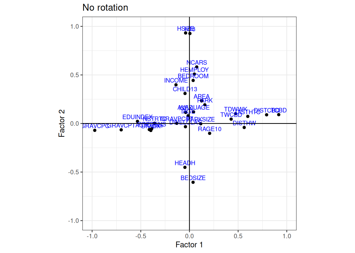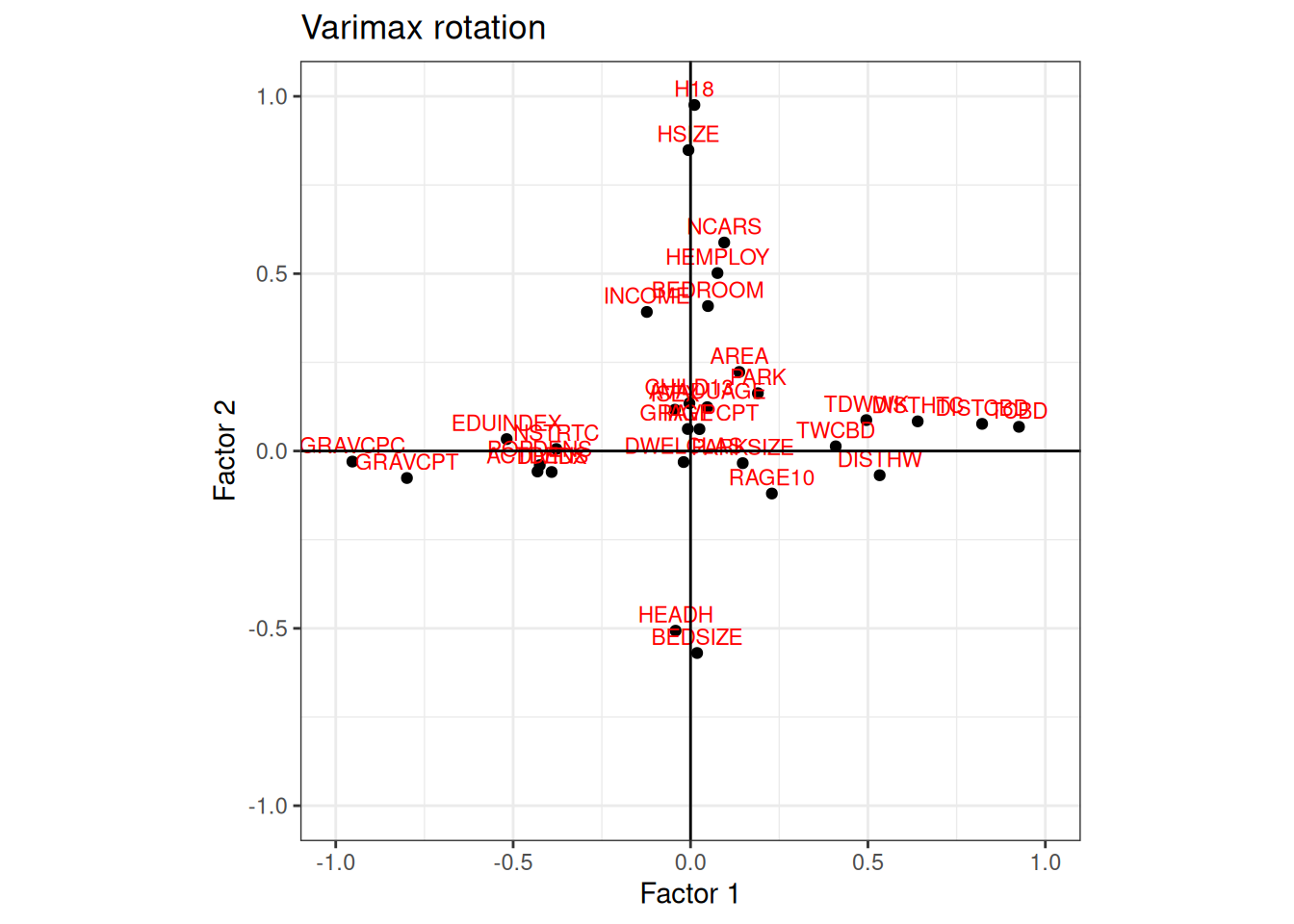 Try comparing the plots with the factor loadings and plot the other factor pairs (replace f1 and f2) to get more familiar with exploratory factor analysis.