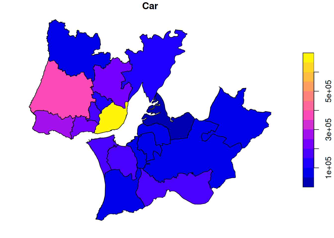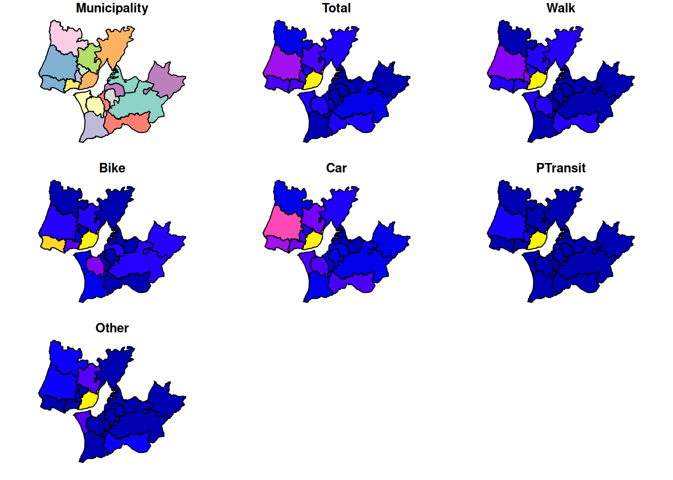 plot(TRIPSgeo) # all variablesplot(TRIPSgeo["Municipality"])plot(TRIPSgeo["Total"])plot(TRIPSgeo["Car"])# plot pointy data